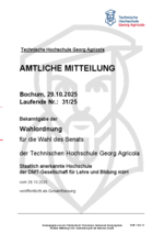 - Wahlordnung für die Wahl des Senats Die Wahlordnung regelt die Verfahren, Fristen und Modalitäten zur Wahl der Mitglieder des Senats, einschließlich Wahlberechtigung, Kandidatur, Stimmabgabe und Auszählung. pdf, 924 KB
