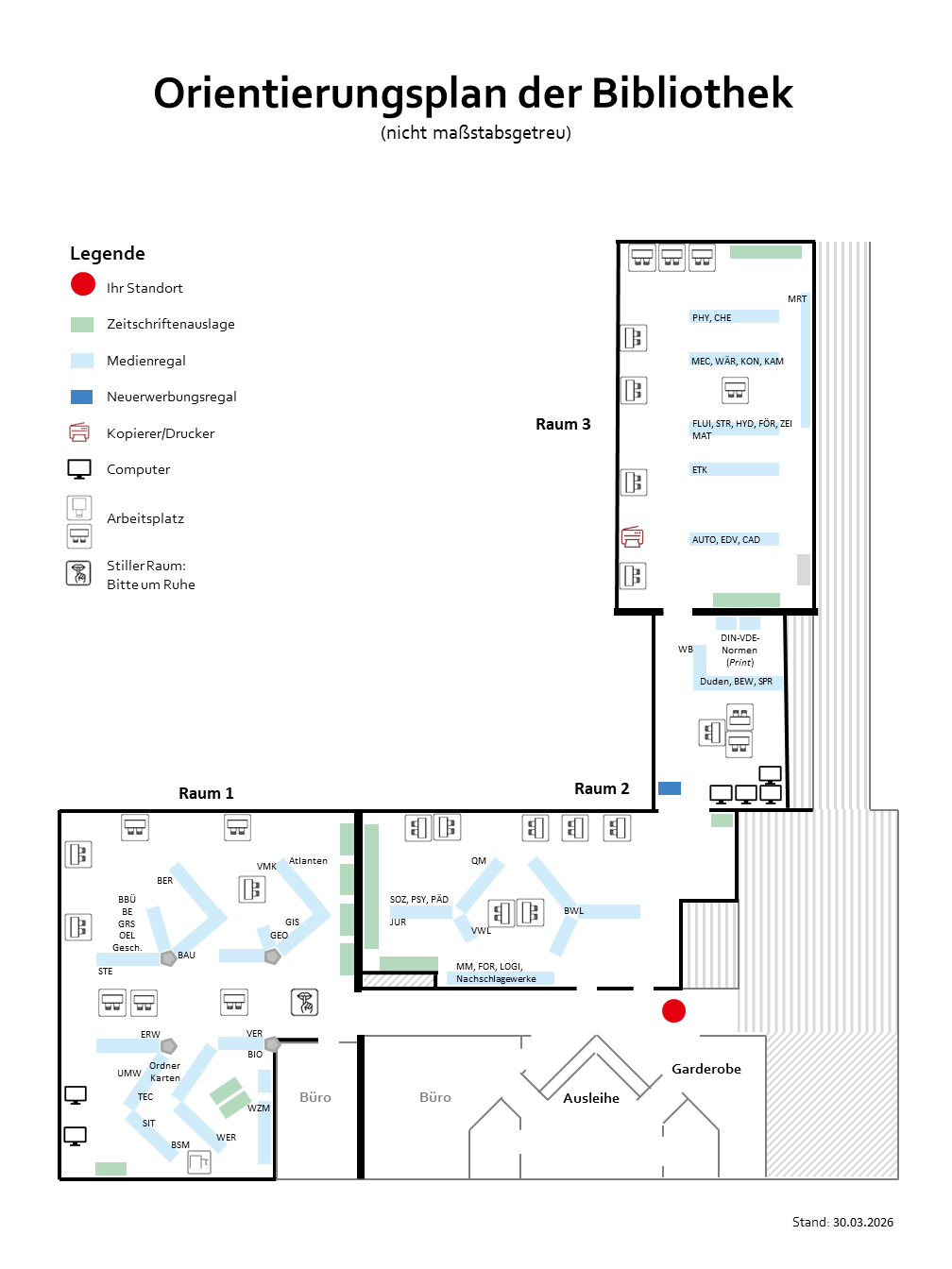 Im Bibliothekskatalog sind unterschiedliche Standorte angegeben. Damit sind Bereiche gemeint, an denen Bibliotheksmedien aufgestellt sind. Diese Standorte sind für Sie entweder frei zugänglich oder nicht frei zugänglich. Zusätzlich sind damit bestimmte Nutzungsmöglichkeiten verbunden.